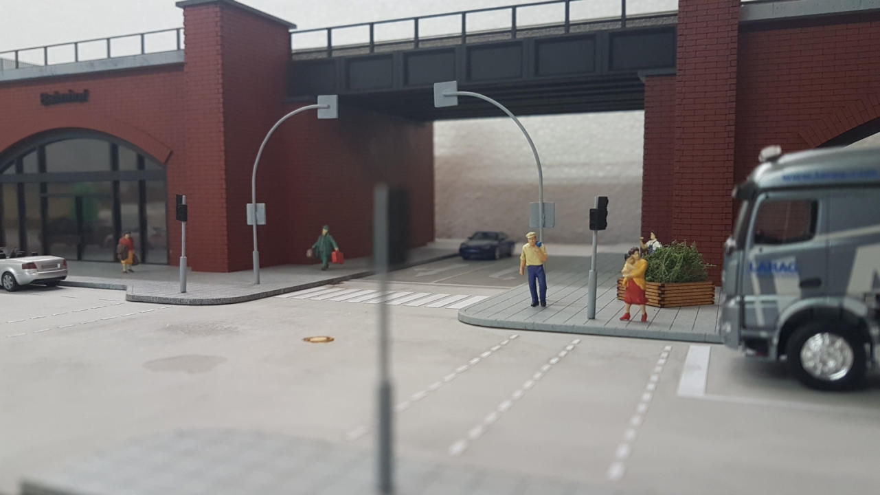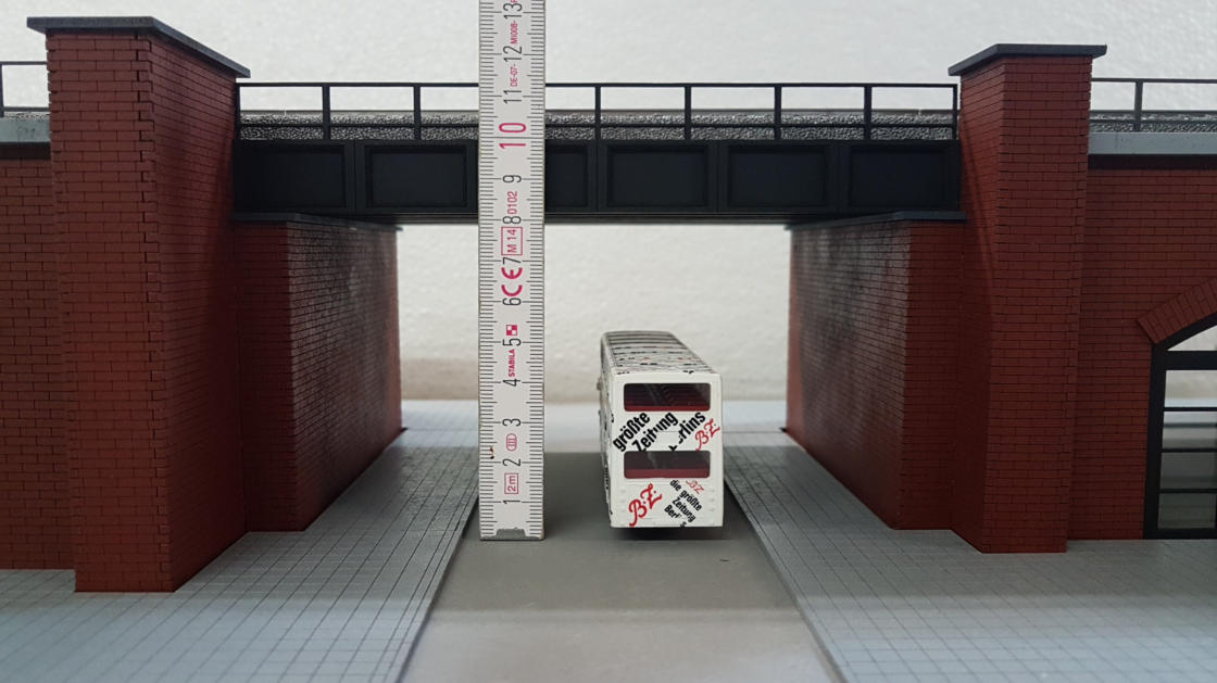 Wir haben hier eine Durchfahrtshöhe von 80 mm.Diese Höhe eignet sich Ideal auch für die Durchfahrt einer Trambahn,mit einer vorbildlichen Montage einer Oberleitung.