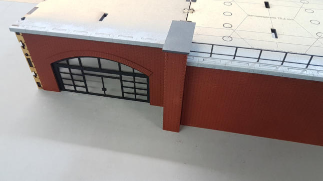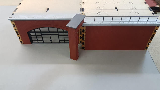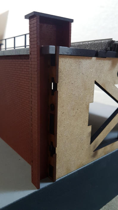 Platzieren sie bündig die Modusteck Arkadengegeneinander und sichern sie diese mit dem korrekten Verbinder.jetzt haben sie den korrekten abstand, umdie Seitenverblendung einzufügen. Die Seitenverjüngung wird ohne weitere änderung an der Arkadenfassede wie bei einer bündigen Fassade eingesteckt. wie sie auf der linken seite am schnittmodell erkennen. haben sie die möglich-keit hier auch zugängig die kabel für fahrstrom oder beleuchtung zu verlegen. eine verklebung muss nicht unbedingt erfolgen. durch die zapfen wird die seiten-verblendung immer korrekt einrasten und bündig ab-schließen. bei der anbringung einer abschlußverblendungverkleben sie bitte nicht alle teile sofort miteinander, da dann sonst das verzapfen nicht mehr möglich ist.