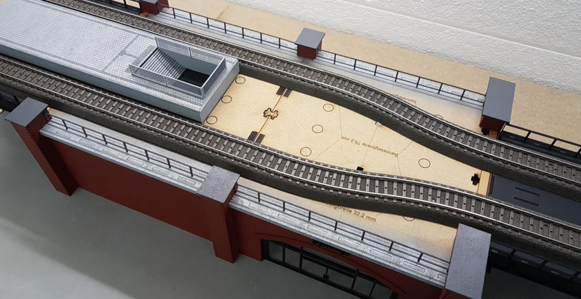 In einigen Fällen ist es üblich, dass das Viadukt (gemauerte Arkade) zu einer Hochbahn wechselt. So ist der untere Bereich für weitere Gegebenheiten, wie Autos, Busse, LKW, Straßenbahn usw. frei verfügbar. Auch kommt es vor, das sich darunter Parkanlagen oder Wochenmärkte befinden, um den darunter-liegenden Platz sinnvoll zu nutzen. Hier haben Sie viele Möglichkeiten eine vorbildliche Situation nach Ihrem Geschmack darzustellen. Wir bieten Ihnen die Möglichkeit in unterschiedlichen Breiten, Ihre Hochbahn zu gestalten. Das Prinzip der Montage und Anwendung ist wie beim restlichen Modusteck System bekannt. Im Augenmerk liegt selbstverständlich der modulare Aufbau und die Ergänzung zum restlichem Modusteck System. Wir bieten Ihnen auch mit weiterem Zubehör die Möglichkeit einen hochliegenden Bahnhof, Bahnsteig umzusetzen. Auch hier ziehen wir wieder unterschiedliche Vorbilder heran und setzen dieses optimal für Ihren Gebrauch um. Übergänge vom Viadukt (gemauerte Arkade), werden mit passenden Abschlusskanten, die auch für eine stabile Verbindung der Fahrstrecke sorgen,verbunden.