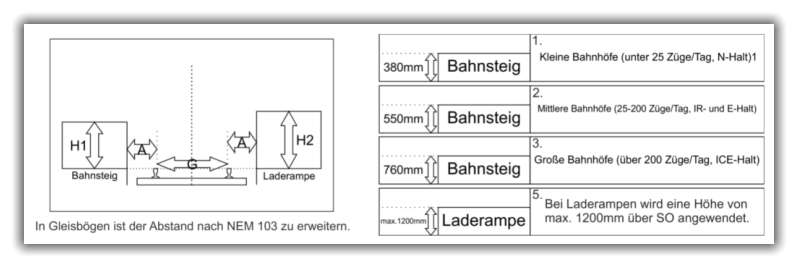Regellichtraum nach NEM 102 bis hin zur Fahrzeugumgrenzung nach NEM 301. Unsere Bahnsteige und Laderampen sind nach NEM 102/103